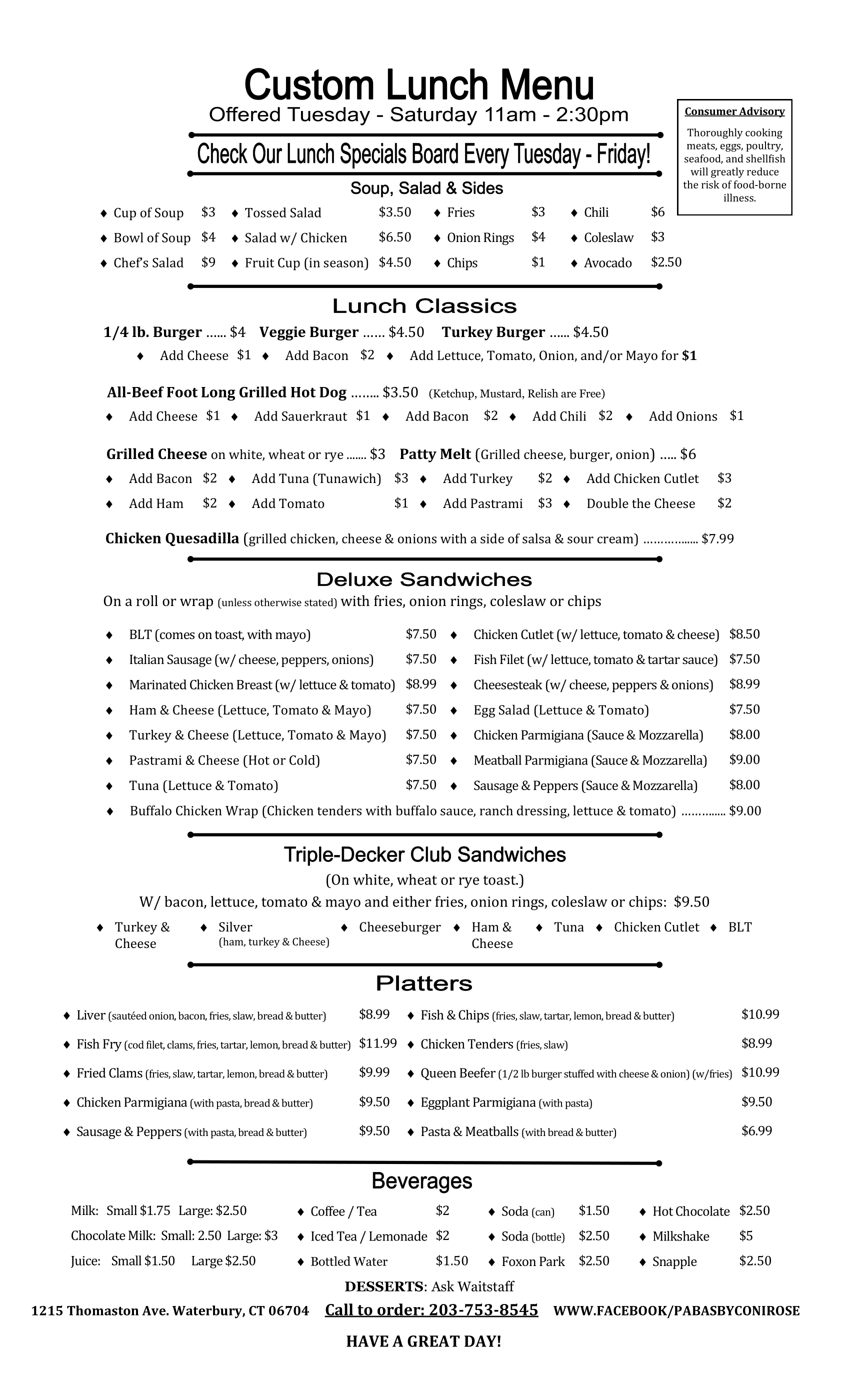 Her new menu is full of top quality breakfast, lunch, and daily homestyle dinner and soup specials! Paba's is here to satisfy. Buon appetitto!